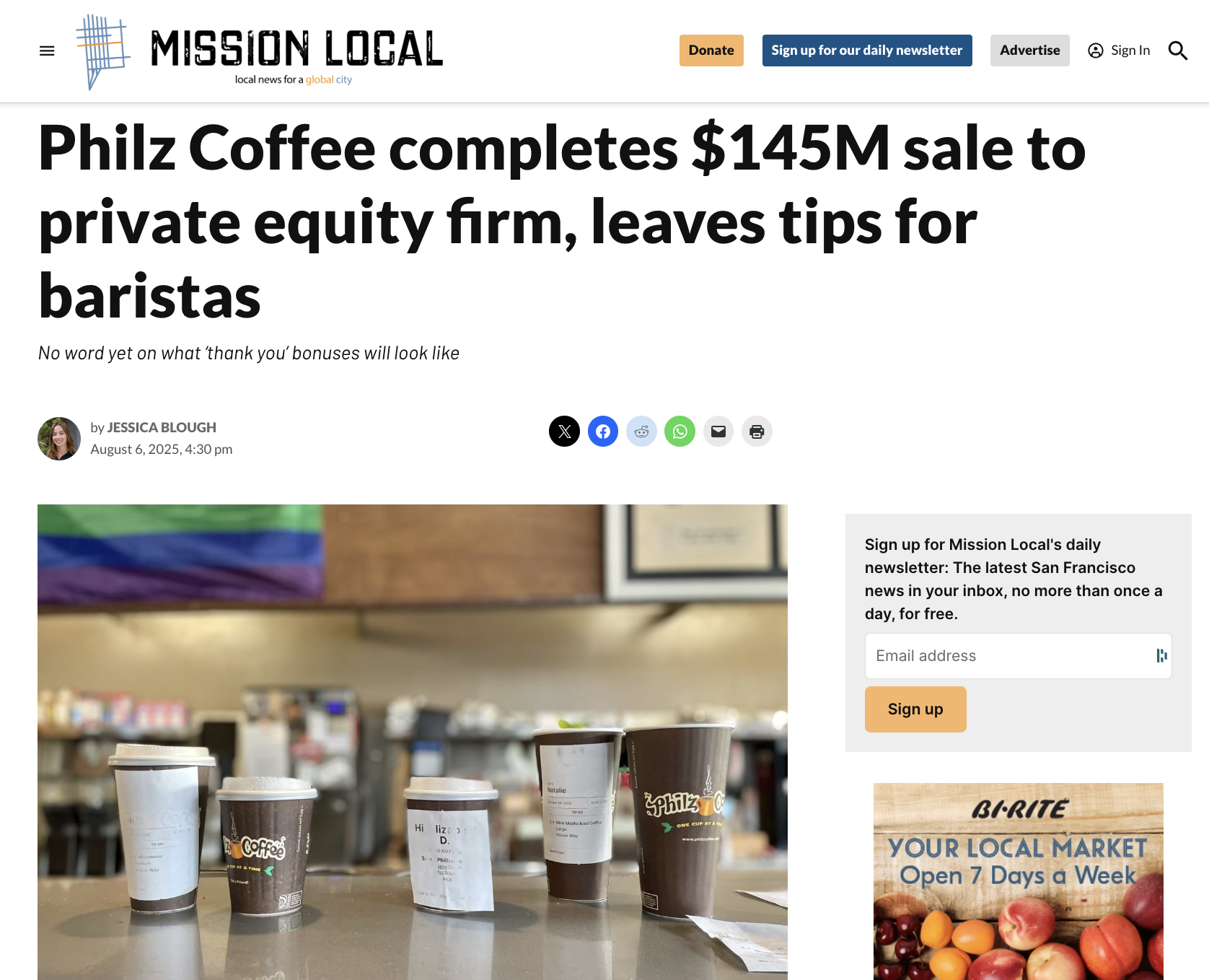 ONE//Philz: While this one is a bit local-ish, many of you know that this one hurts. Following the news that, Philz Coffee close to closing deal to sell to private equity firm for $145 million: Stock-owning employees will be left out in the cold the sale as been finalized as reported by Mission Local, Philz Coffee completes $145M sale to private equity firm, leaves tips for baristas: No word yet on what âthank youâ bonuses will look likethe