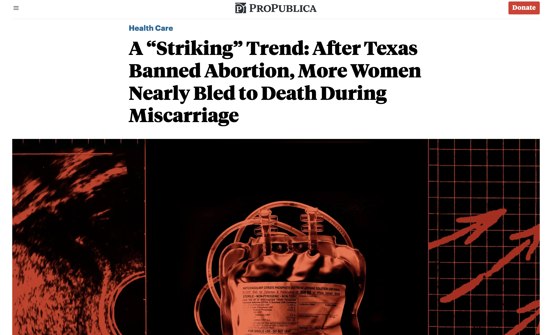 After Texas made performing abortions a felony in August 2022, ProPublica found, the number of blood transfusions during emergency room visits for first-trimester miscarriage shot up by 54%.